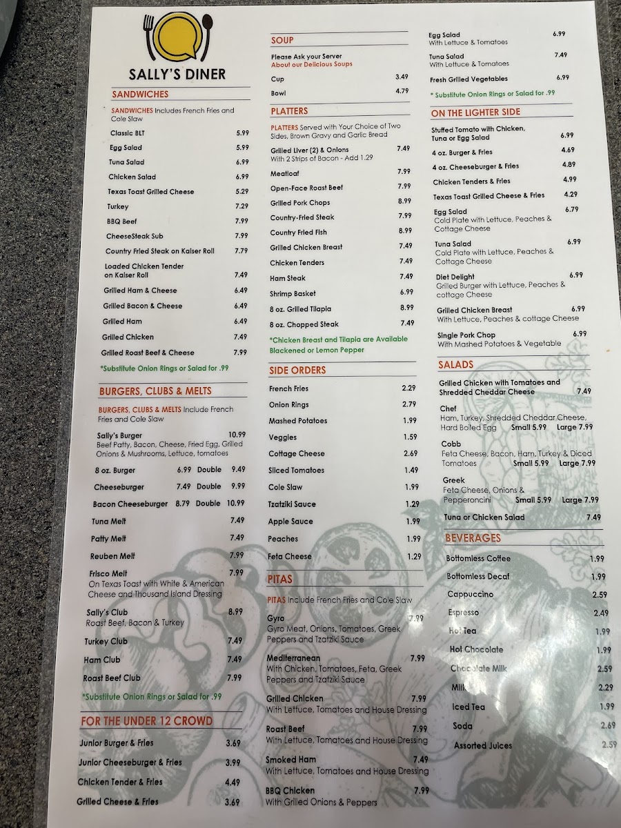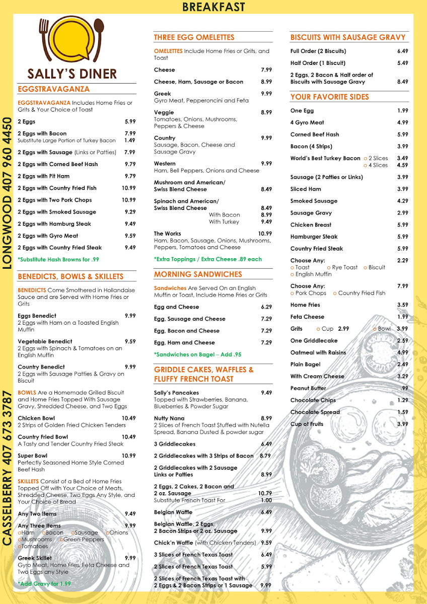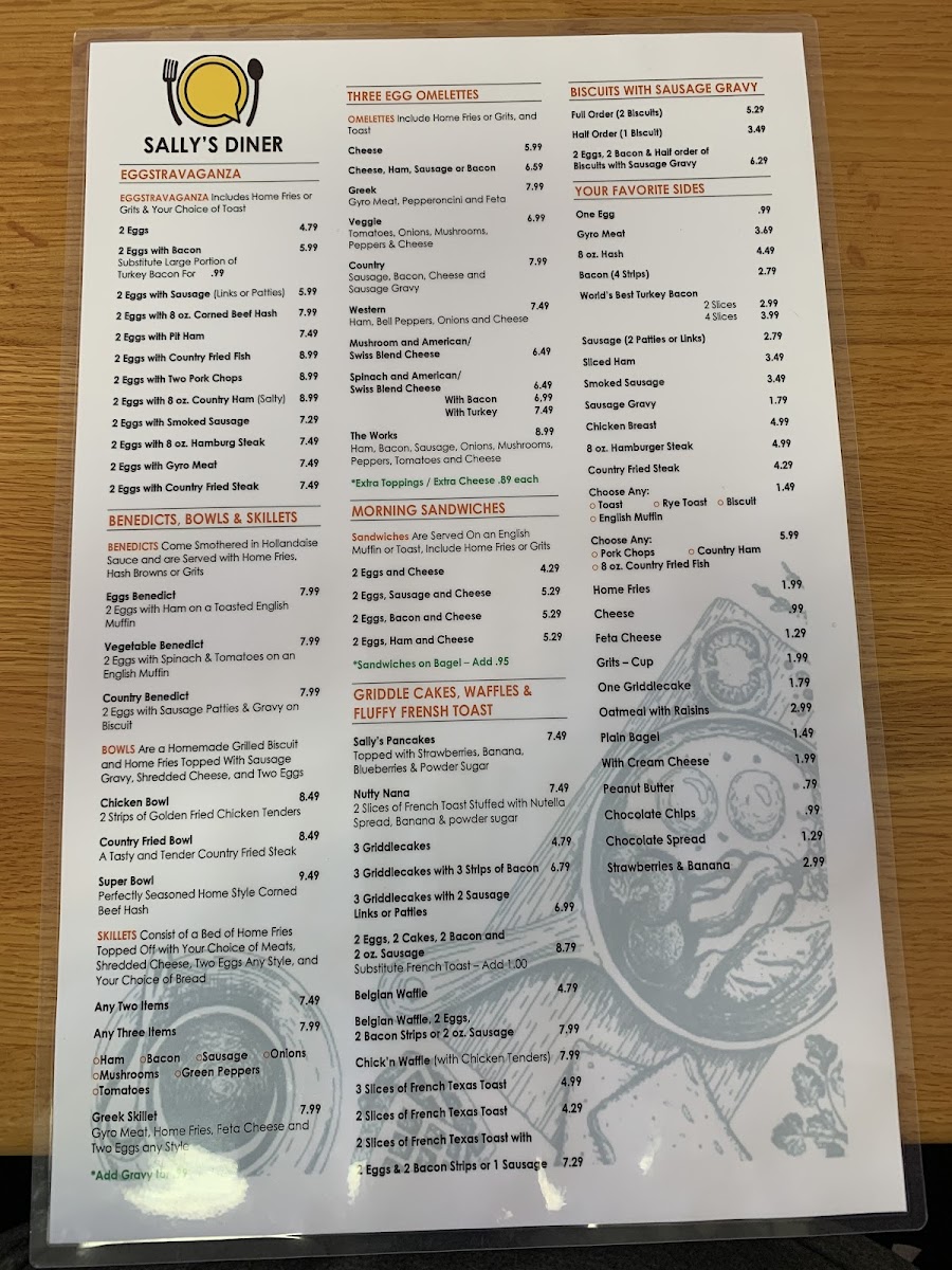 Sally’s Diner offers a straightforward and comforting menu that captures the essence of a classic American diner with a Southern twist. The menu features familiar breakfast staples like home fries, grits, biscuits and gravy, and smoked sausage with eggs, providing simple yet satisfying options that fit perfectly into a relaxed morning or midday meal.