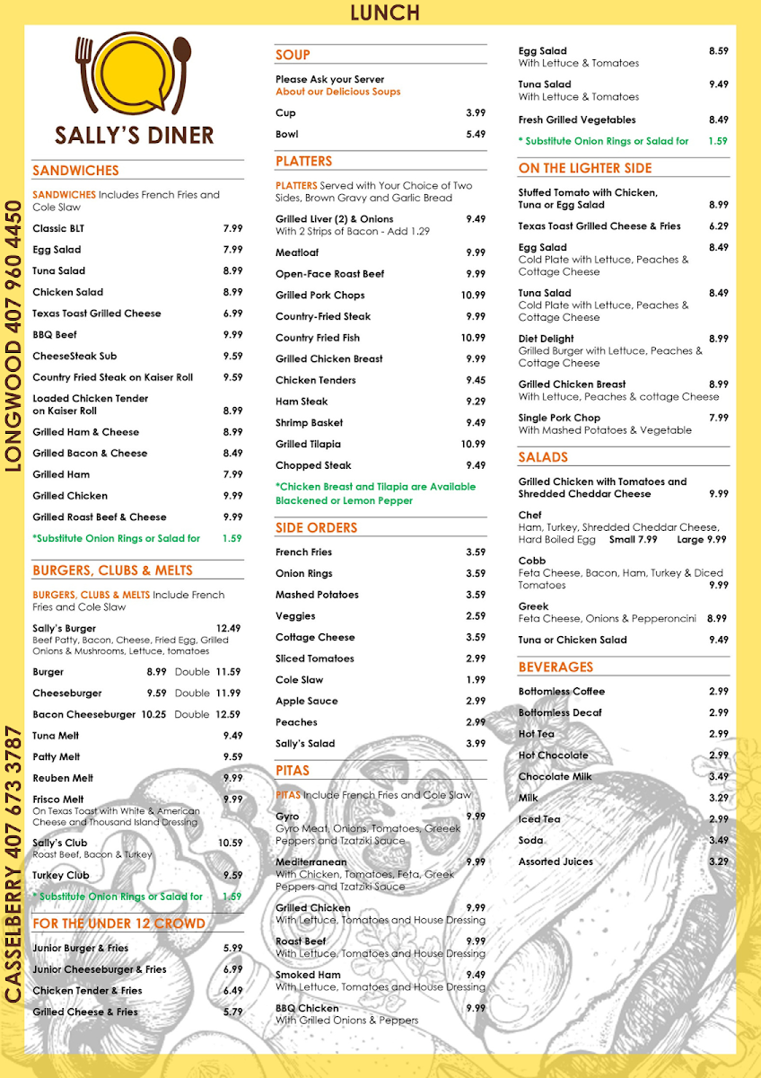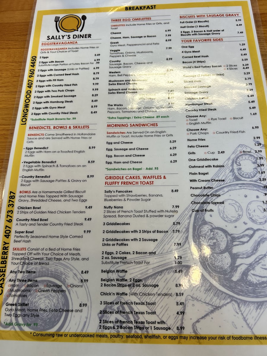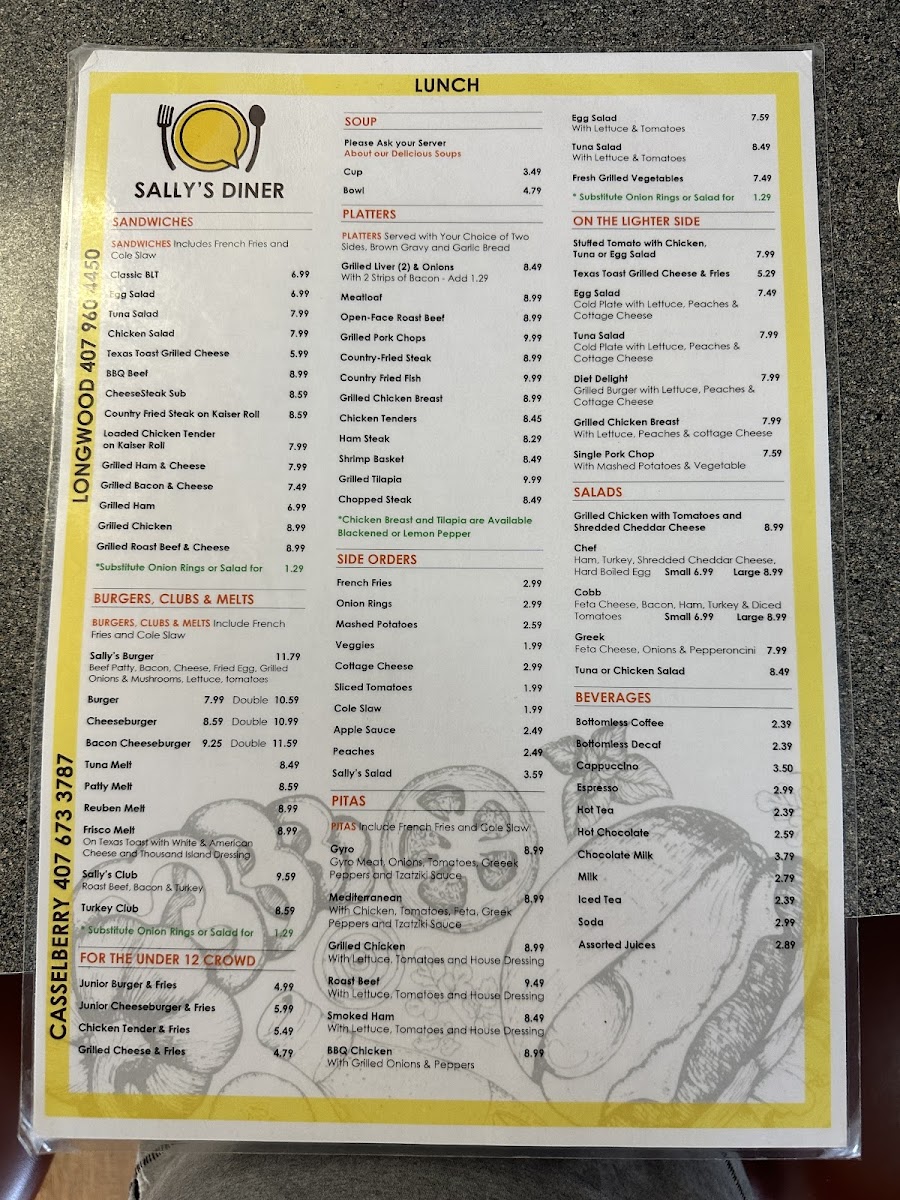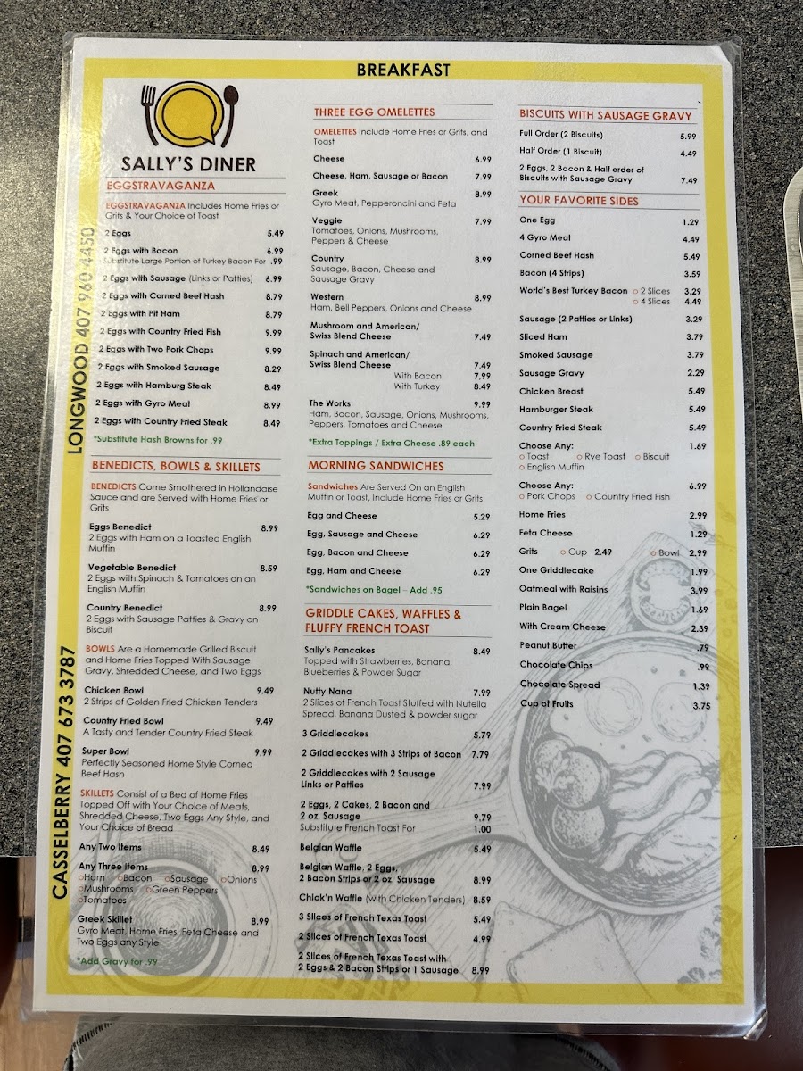 Sally’s Diner offers a straightforward and comforting menu that captures the essence of a classic American diner with a Southern twist. The menu features familiar breakfast staples like home fries, grits, biscuits and gravy, and smoked sausage with eggs, providing simple yet satisfying options that fit perfectly into a relaxed morning or midday meal.